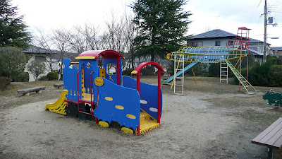 ここはあすか野南の緑道の北に隣接する遊具の広場である。遊具の広場だけにすべり台は一つではない。下の写真の遊具も立派なすべり台である。汽車のすべり台は最近設置されたようでまだ真新しい。飛行機のすべり台は北登美ヶ丘4号街区公園にもあった。